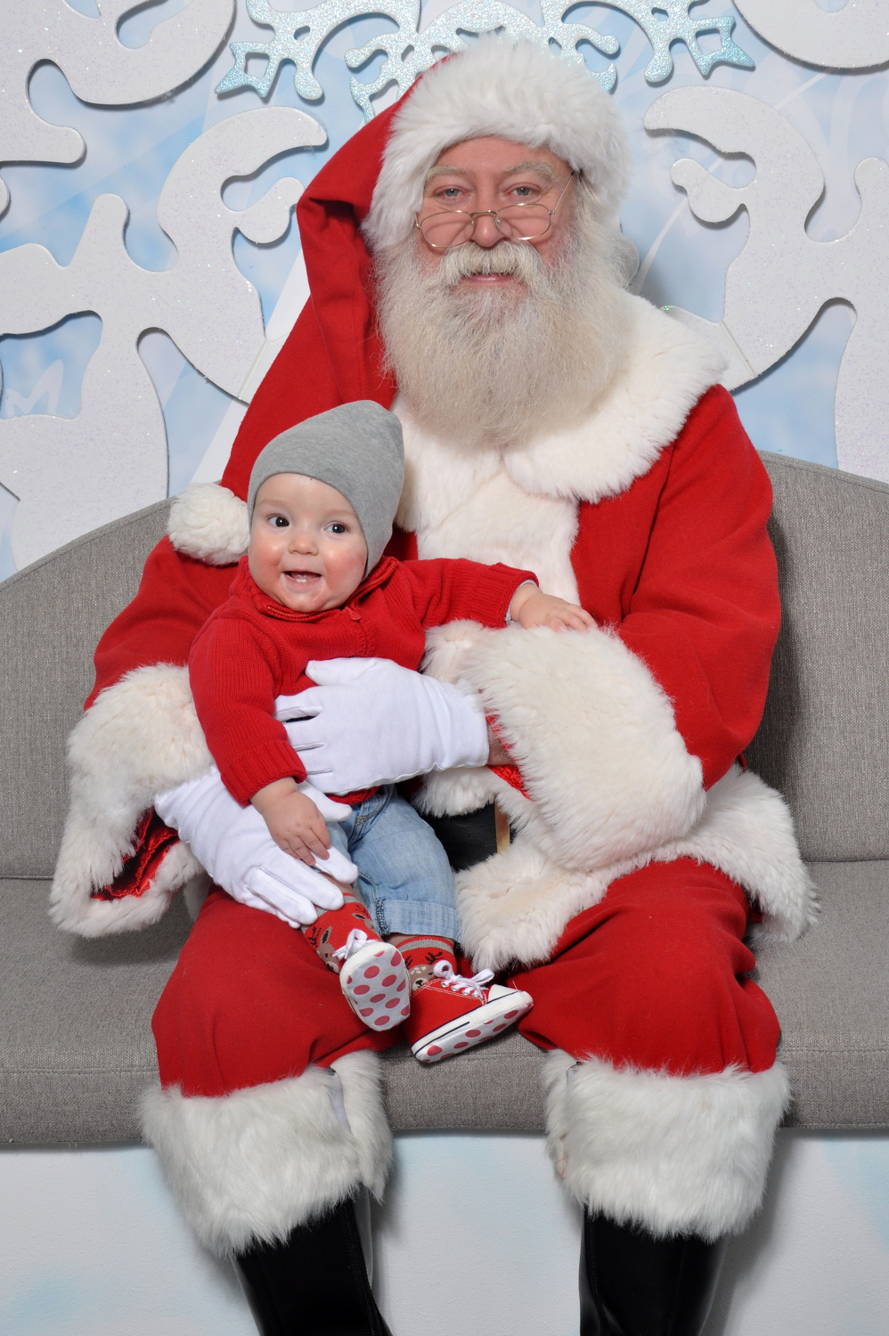 And now, we’ve got a gorgeous picture of a happy seven and a month old baby boy, sitting with Santa and smiling for the camera.
