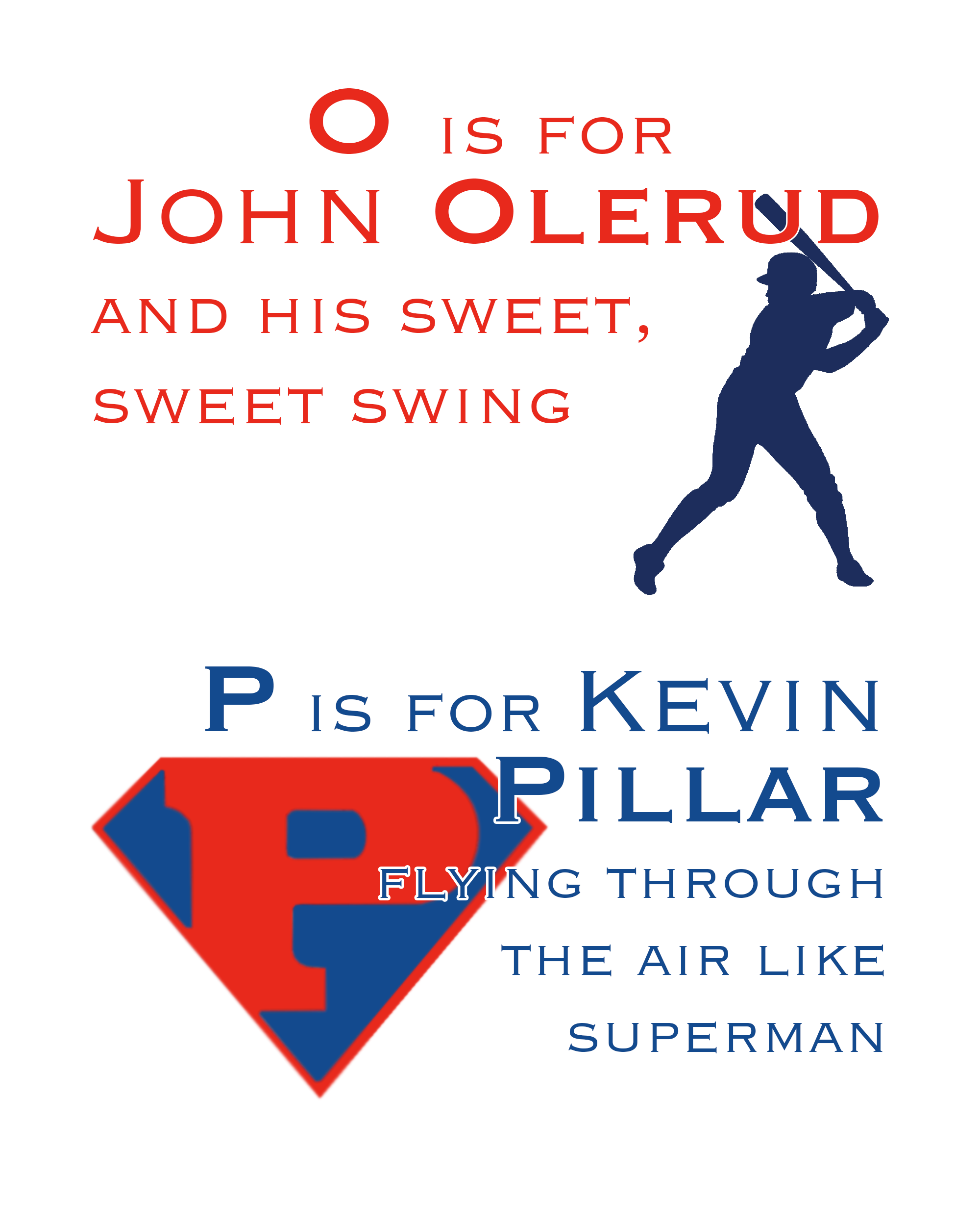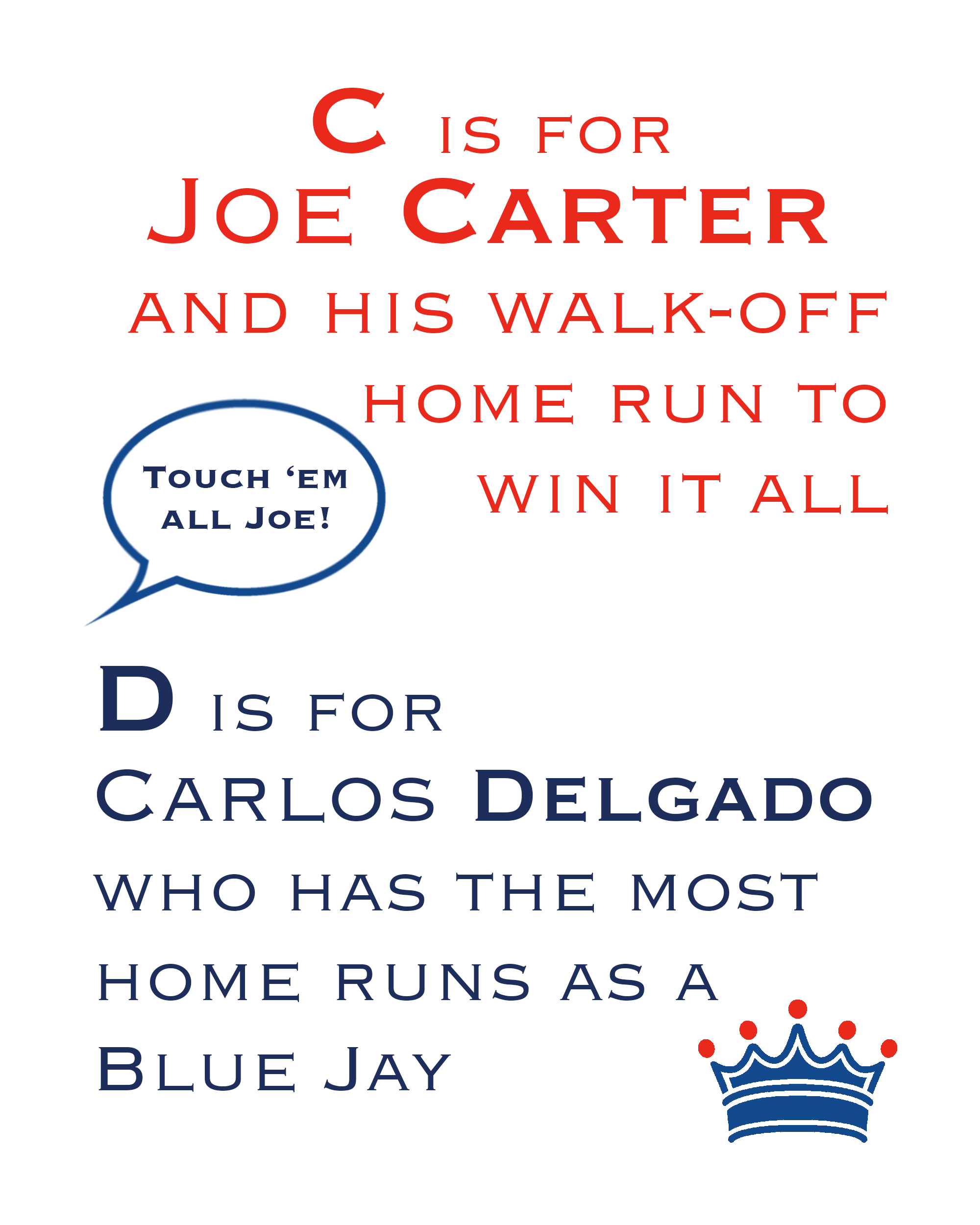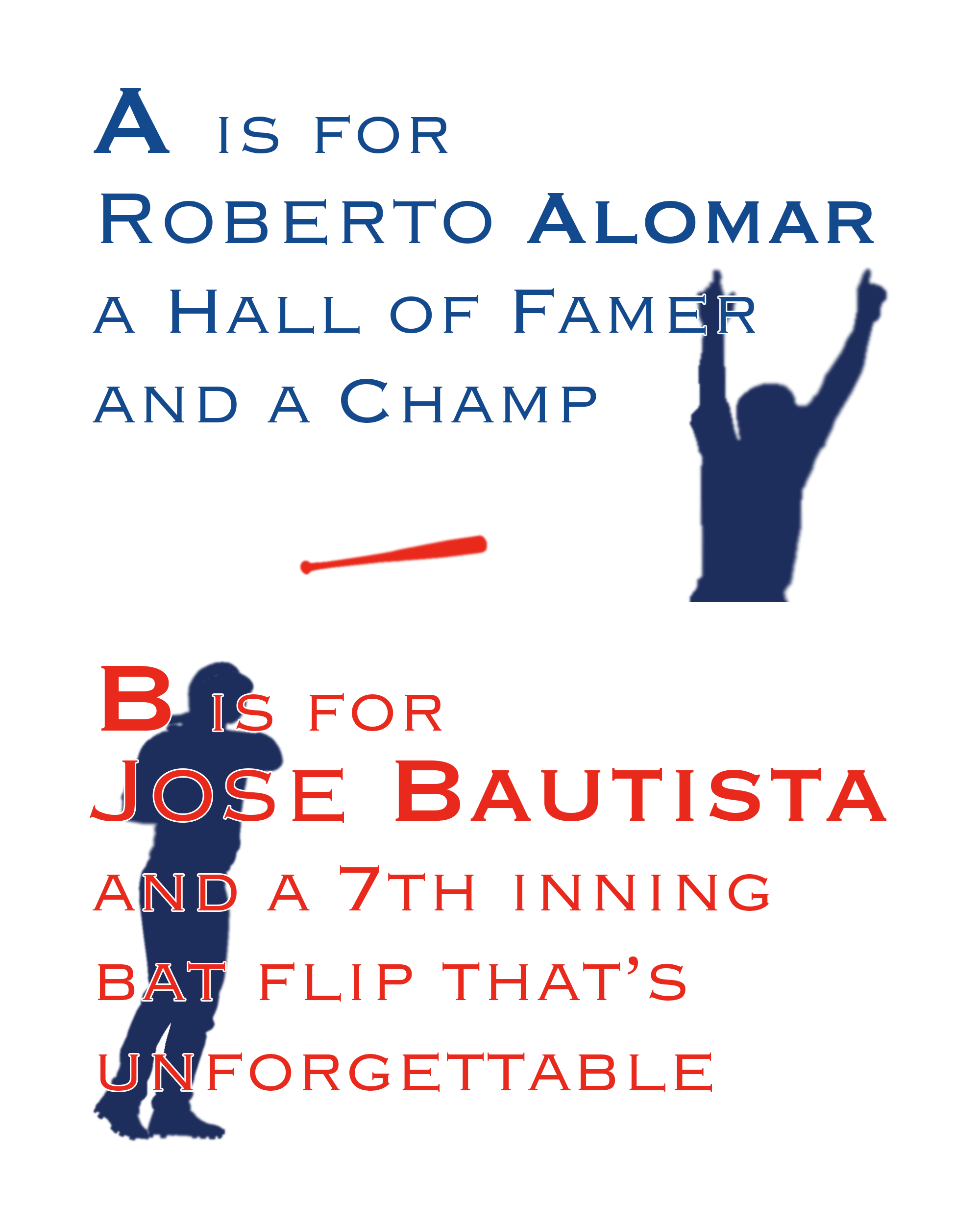Ollie’s two years old right now, so we’ve still got some time before we ship him off to school – but we are doing number and letter work with little kid books around the condo. He’s got a Toronto ABCs book and a hockey ABCs book, a DC Comics ABCs book and more. But what he doesn’t have is a Toronto Blue Jays ABCs book.