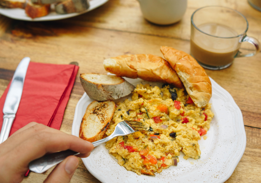 Start with diced onion and bell pepper in a frying pan with some garlic, get that going until you have your onions cooking. Add diced turkey and stir to heat evenly. Whisk eggs with a splash of milk and salt and pepper and pour that into the pan and scramble and cook. Serve with toast for breakfast, brunch, lunch, whatever!